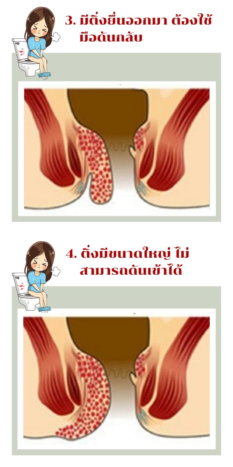 2)ริดสีดวงภายนอก เริ่มมีติ่งยื่นออกมา หากปล่อยทิ้งไว้หรือรักษาไม่ถูกวิธี ติ่งนั้นจะไม่สามารถดันเข้าได้